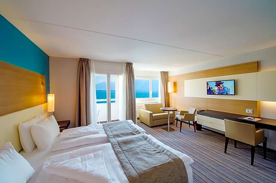 Für lebhafte Gastronomie sorgt das Safran Restaurant Terrasse, ein modernes Lokal, das französische und mediterrane Aromen in stilvollem Ambiente anbietet. Am Abend sorgen kostenlose Live-Musikauftritte für Stimmung und sind ideal, um nach einem Tag in Montreux zu entspannen. Ein Sonnendeck lädt zum Verweilen ein, und Strandangebote wie Sonnenschirme und Liegestühle stehen Gästen kostenlos zur Verfügung.